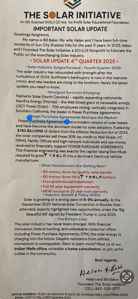 Bill’s “Solar for the Home” training is more than just an educational session; it’s a community-oriented initiative aimed at empowering residents with the knowledge they need to make a positive impact on their environment and energy bills through solar power. Bill offers a complimentary breakfast for two at Shadow Hills restaurant starting at 8:30 am every Tuesday. Bill is personally inviting you to this complimentary education breakfast, bringing you up-to-date on what is happening in the solar industry.